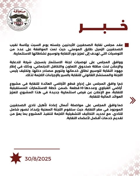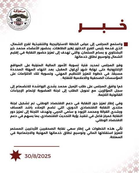 تأتي هذه الخطوات في إطار سعي نقابة الصحفيين الأردنيين المستمر لتعزيز استقلالها المالي وتوسيع نطاق خدماتها المهنية والاجتماعية في المملكة.