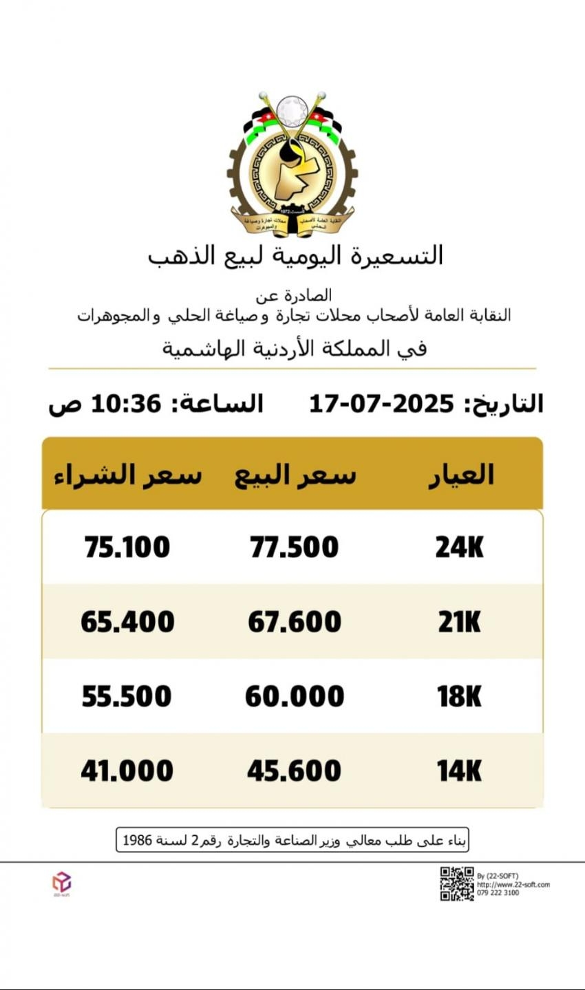 كما بلغ سعر بيع الغرام الواحد من الذهب لعيارات 24 و18 و14 في محالّ الصاغة 77.5 دينارًا، و60 دينارًا، و45.6 دينارًا على التوالي.
