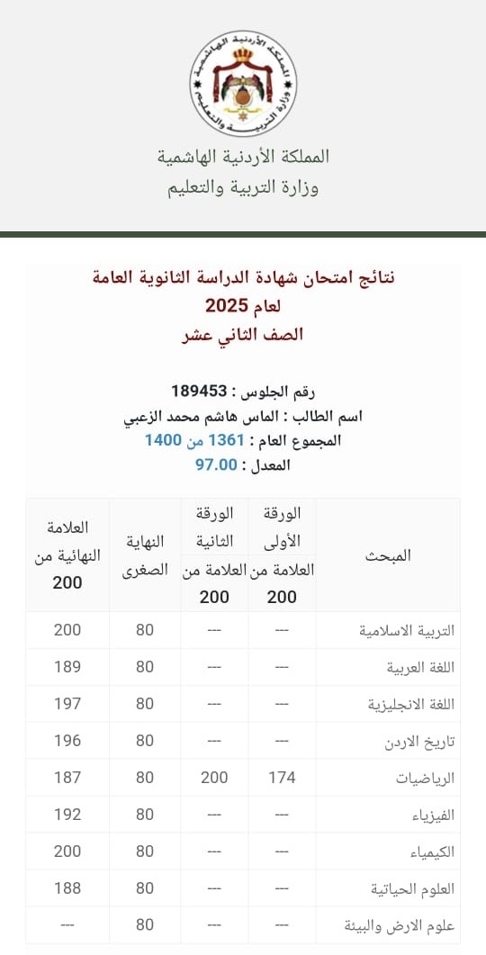 تتقدم سبق نيوز بالتبركات إلى السيد هاشم محمد الزعبي بمناسبة تفوق ابنته الماس بامتحان الثانوية العامة وحصولها على معدل ٩٧ الفرع العلمي